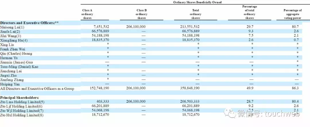 中通快递日前向美国SEC递交2018年年报,年报显示,截至2019年3月31日,中通快递董事长赖梅松持有中通快递27.1%股权,拥有78.3%的投票权,为最大股东。