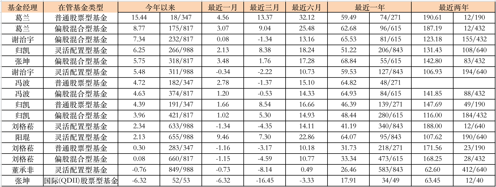 从明星基金经理的持仓表现来看,根据wind数据,今年以来,张坤、刘格菘、谢治宇、董承非等明星基金经理管理的股票型和混合型基金多实现正收益,董承非在管的一款灵活配置型基金微跌。