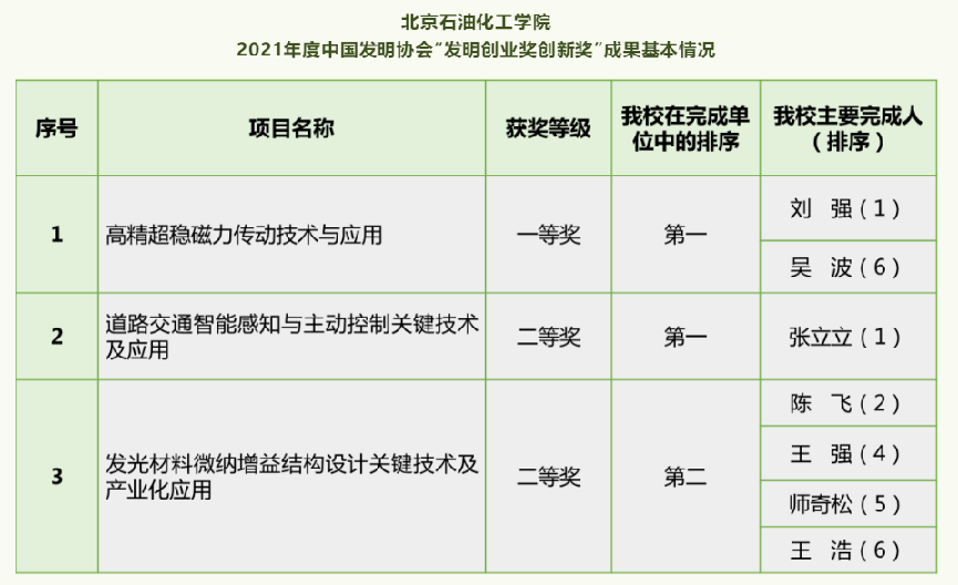 北京石油化工学院荣获2021年中国发明协会“发明创业奖创新奖”一等奖1项、二等奖2项,3项成果均创造了可观的经济和社会效益。
