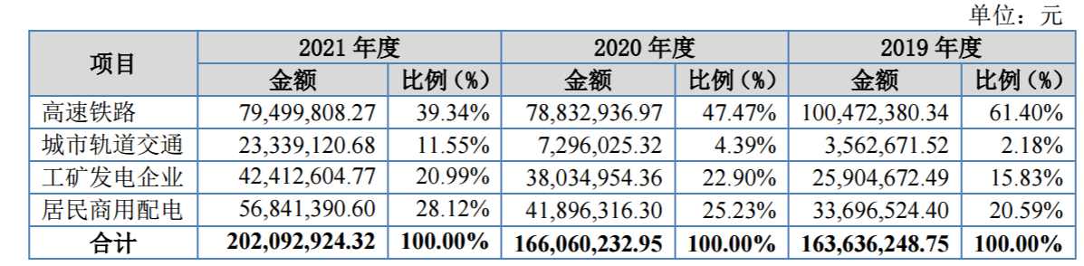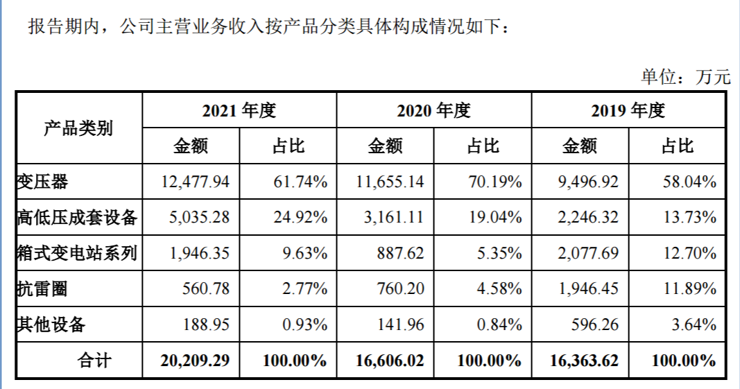 变压器为公司的主要产品,主要用于高速铁路、居民配电、城市轨道交通等领域。2019 年至 2021 年,变压器收入占主营业务收入比例分别为 58.04%、70.19%和 61.74%。高低压成套设备是公司的重要产品,报告期内高低压成套设备收入占公司主营业务收入比例分别为 13.73%、19.04%和 24.92%。箱式变电站系列产品是公司主营业务的重要组成部分,报告期内箱式变电站系列产品收入占公司主营业务收入比例分别为 12.7%、5.35%和 9.63%。
