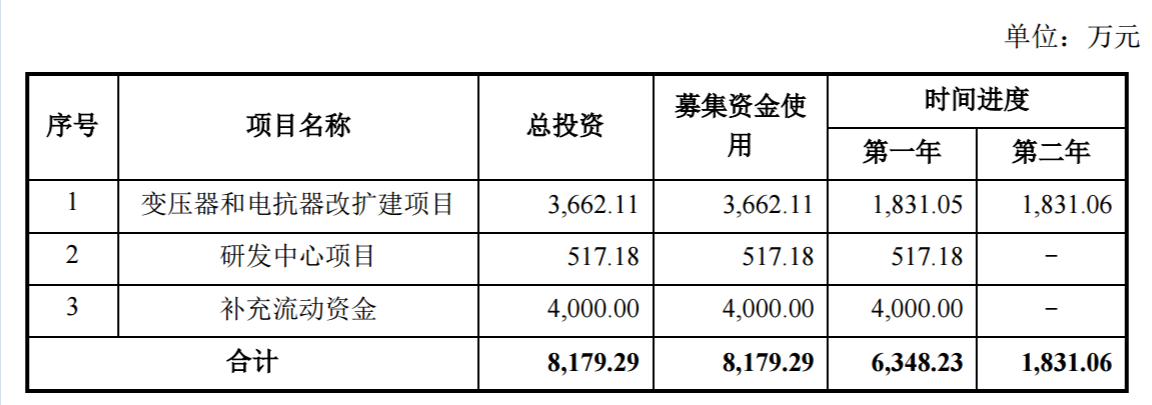 变压器和电抗器改扩建项目:预计总投资 3662.11 万元,拟在现有场地,利用 3115.35 万元进行建设投资,铺底流动资金 546.76 万元,新增设备 39 台/套,项目计划建设周期 2 年。项目的顺利实施,将新增年产变压器和电抗器900台。在项目建成投产后,随着业务规模的不断扩大,年均新增营业收入6300万元,新增年均税后净利润为986.49万。