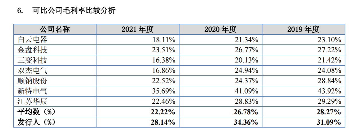 公司的营业毛利率高于可比公司中的顺钠股份、金盘科技、三变科技、双杰电气、 白云电器及江苏华辰,低于可比公司中的新特电气。变压器是公司最主要的产品,报告期内其毛利率分别为 35.92%、34.98%及 28.03%。2021 年毛 利率下降主要是受铜材、铁芯原材料价格大幅上涨的影响。