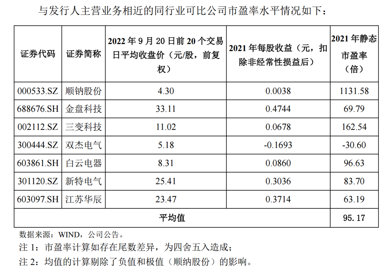 上述同行业可比公司 2021 年静态市盈率均值为 95.17 倍。“电气机械 和器材制造业”(C38)最近一个月平均静态市盈率为 35.43 倍。