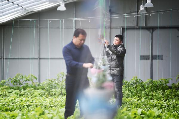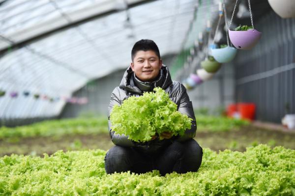 在黑龙江北大荒农垦集团双峰农场有限公司果蔬产业园区智控温室,工作人员在展示刚采摘的生菜(3月5日摄)。新华社记者 王建威 摄