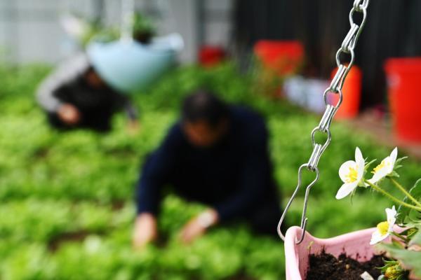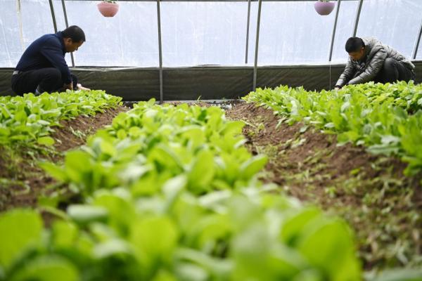 在黑龙江北大荒农垦集团双峰农场有限公司果蔬产业园区智控温室,工作人员在清除作物间的杂草(3月5日摄)。新华社记者 王建威 摄