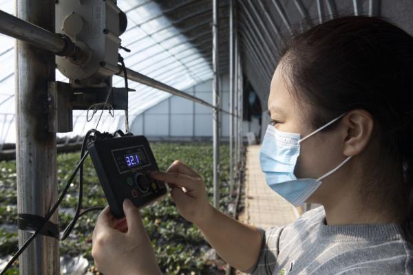 在黑龙江北大荒农垦集团双峰农场有限公司果蔬产业园区智控温室,工作人员在检查喷灌设备(3月5日摄)。新华社记者 王建威 摄