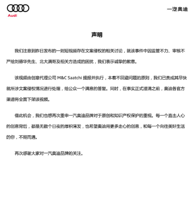 5月21日,“小满”节气当天,一汽奥迪在其官方渠道发布了由刘德华主演的视频广告《人生小满》。当晚,短视频博主“北大满哥”发文质疑该文案抄袭他在去年小满节气发布的一条视频文案,两者在文字编排上几乎一模一样。