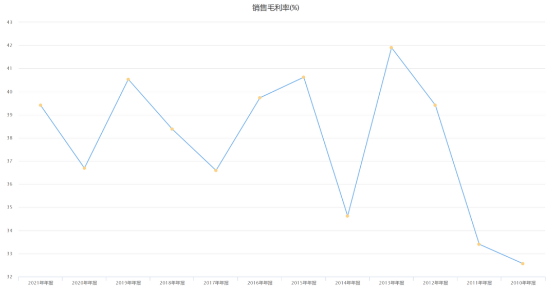 近十年除2014年之外,毛利率都在40%左右小范围波动。