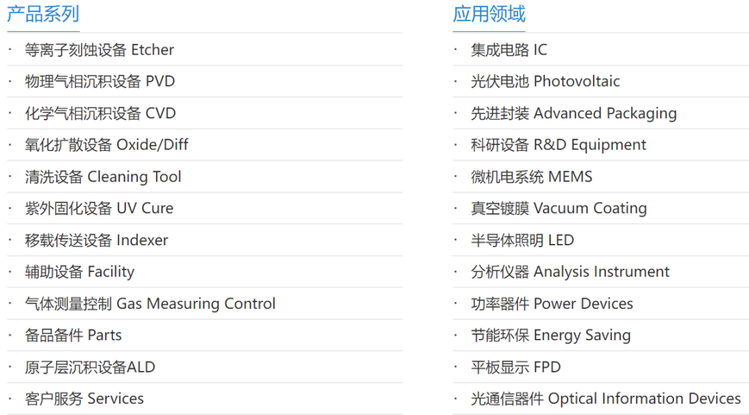 主要产品是等离子刻蚀(Etch)、物理气相沉积(PVD)、化学气相沉积(CVD)、氧化/扩散、清洗、退火等半导体工艺装备,应用在集成电路、封装、LED、MEMS、电力电子、平板显示、光伏电池等半导体相关领域。