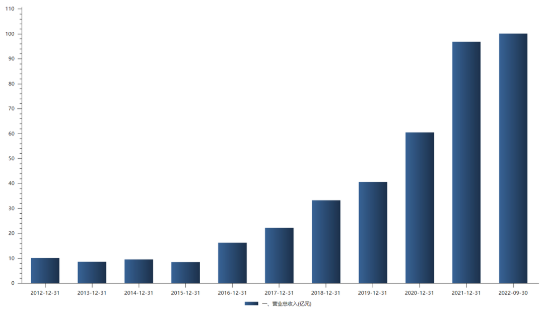 而且近三年的业绩增长也很好,2020年营收61亿,同比增长49%,2021年营收97亿,同比增长60%,2022年三季报营收100亿,同比增长62%。