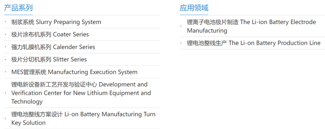 主要产品有生产浆料制备系统、真空搅拌机、涂布机、强力轧膜机、高速分切机等电池极片制造装备。