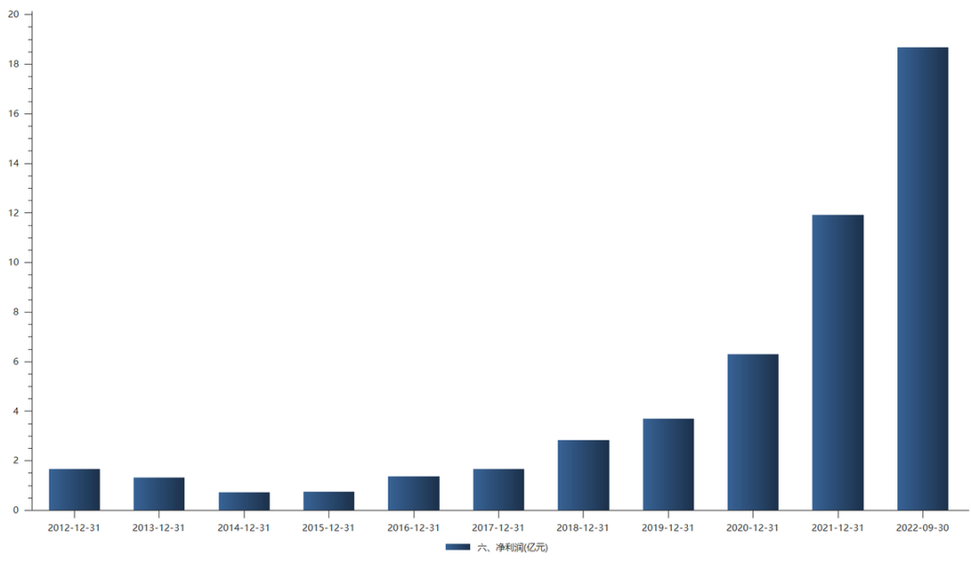 2020年净利润6.3亿,同比增长70.7%,2021年净利润11.9亿,同比增长89%,2022年三季报净利润18.7亿,同比增长145%。