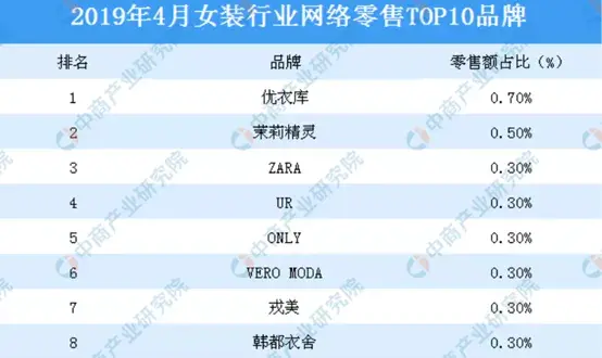 中商研究院曾有过统计,在2019年4月女装网络零售排名前十的品牌中,戎美以0.3%的份额位居第七位。优衣库排名第一,Zara排名第三,only排名第五。