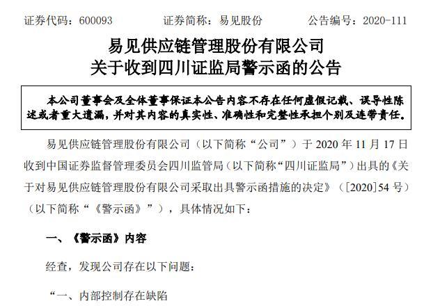 这份警示函指出,易见股份内部控制存在缺陷,“公司部分保理业务客户对应的基础业务和购销合同高度相似,不同保理客户的交易对手方高度相似,有关交易对手方资质与所开展的采购业务规模不匹配,部分保理客户可能属于同一企业控制或存在关联关系。”