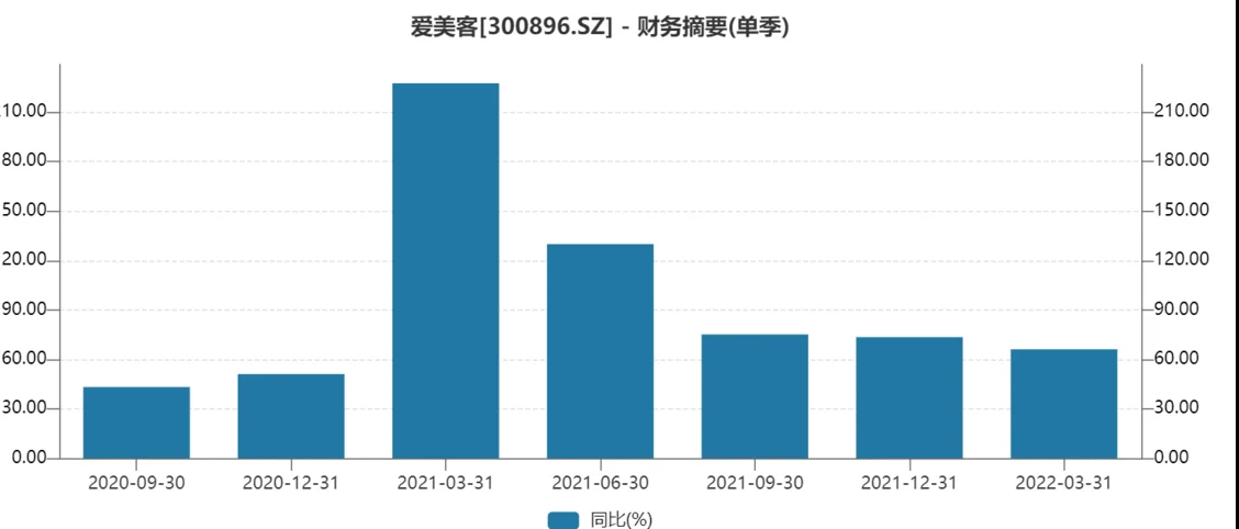 2、爱美客的毛利率虽然堪比茅台,但其营收增长情况却不是很乐观,数据显示,2021年第一季度至2022年第一季度,爱美客的营收增长率分别为227.52%、129.92%、75.09%、73.48%和66.07%,营收增长率呈下降趋势。