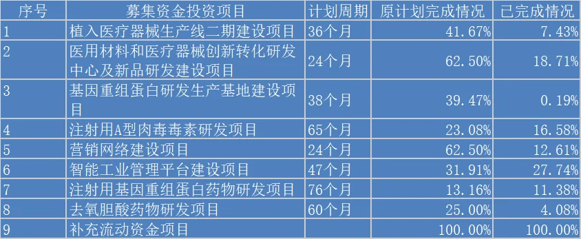 凤凰网财经《IPO观察哨》发现,当时爱美客的A股招股书中披露,大部分募投计划将在两至六年的建设周期内完成,但现在除了补充流动资金项目完成以外,其他研发、生产等项目进展都比较缓慢。