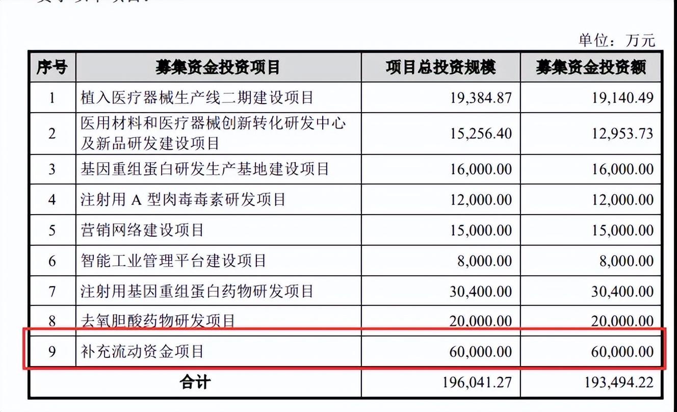 然而,在A股IPO上市时,爱美客IPO募资金额19.35亿中有6亿被用于“补充流动资金项目”,在招股说明书中着重强调企业经营和技术研发需要较大流动资金支持。