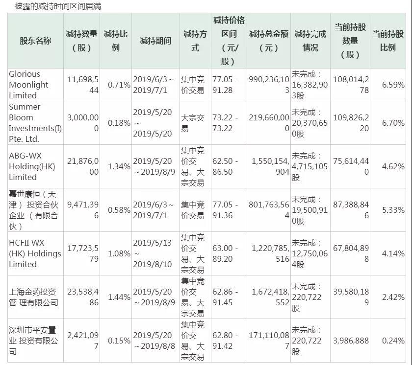 这些股东包括:Glorious MoonlightLimited、Summer Bloom Investments(I)Pte.Ltd.、ABG-WX Holding(HK)Limited、嘉世康恒(天津)投资合伙企业(有限合伙)、HCFII WX(HK)Holdings Limited、上海金药投资管理有限公司、深圳市平安置业投资有限公司。