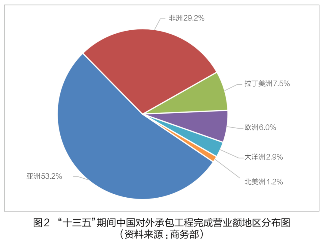 对外承包工程市场和行业分布日益广泛,目前已遍及200多个国家和地区,其中亚、非、拉地区的营业额占总数的九成以上。亚洲仍然是中国对外承包工程最主要的市场,“十三五”期间,亚洲地区累计完成营业额4117.3亿美元,占总完成营业额的53.2%;累计完成新签合同额6145.6亿美元,占总新签合同额的52.2%。二者业绩双双坐稳中国对外承包工程的“半壁江山”。业务领域涉及交通运输、能源电力、工业与民用建筑、石化、通讯等国民经济的各个领域。“十三五”期间新签合同额主要集中在交通建设、电力工程、一般建筑、石油化工、通讯工程等领域,其中,交通建设、电力工程、一般建筑三大领域新签合同额占总新签合同额的66.4%。