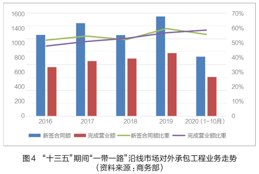 “一带一路”倡议提出以来,中国对外承包工程规模、效益与影响力与日俱增,境外重大项目、基础设施互联互通已成为共建“一带一路”的重要支撑。“十三五”期间,中国企业在“一带一路”沿线国家累计新签合同33878份,新签合同额6435.5亿美元,完成营业额4095.4亿美元,分别占中国对外承包工程新签合同总额和完成营业总额的54.6%和52.9%。巴基斯坦喀喇昆仑公路改扩建工程、柬埔寨桑河二级水电站、马尔代夫中马友谊大桥等项目己经成为当地乃至共建“一带一路”的样本工程和明星工程。这些项目的实施,为深化我国与沿线国家经贸合作、增强我国企业国际竞争力、确保我国区域战略利益发挥了重要作用。