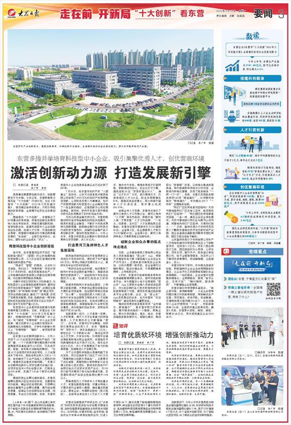 围绕落实“十大创新”,东营推出了90项重点改革举措,将落实创新任务情况纳入综合考核体系,持续完善创新机制。培育创新主体,搭建科技型中小企业创新创业生态圈;加速人才引育,打造创新创业高地;将营商环境建设作为推动高质量发展的“生命线”,全面打造市场化、法治化、国际化的企业成长“沃土”。