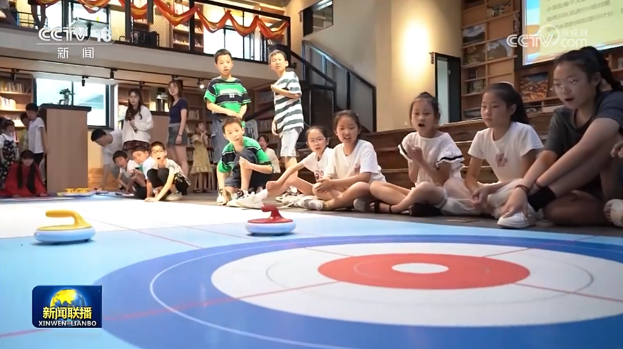 在绍兴竹田头村,偏远村落的孩子们正在新建的农家书屋里体验冰壶课。