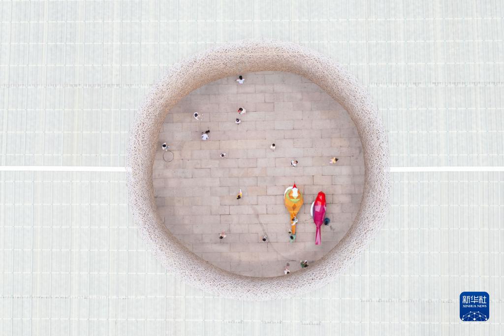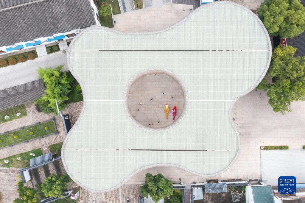 6月7日,在浙江省绍兴市孙端街道安桥头村,孩子们在“弶与小鸟雀”竹弶广场上玩耍(无人机照片)。新华社记者 才扬 摄