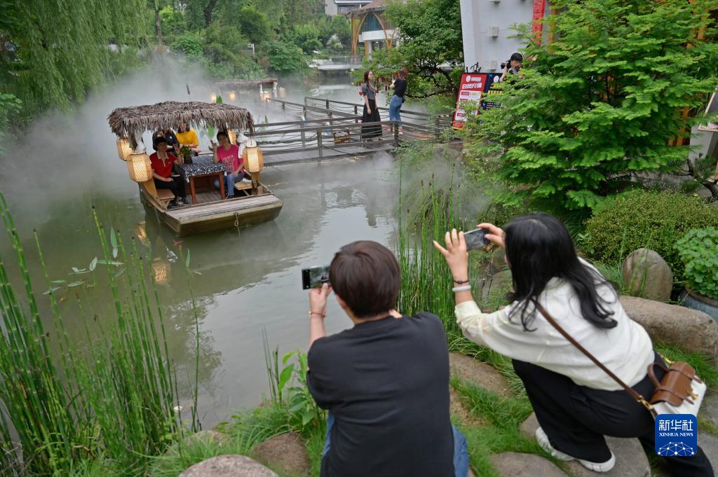 6月5日,在浙江省湖州市安吉县灵峰街道横山坞村,游客在一家民宿拍照留念。新华社记者 才扬 摄