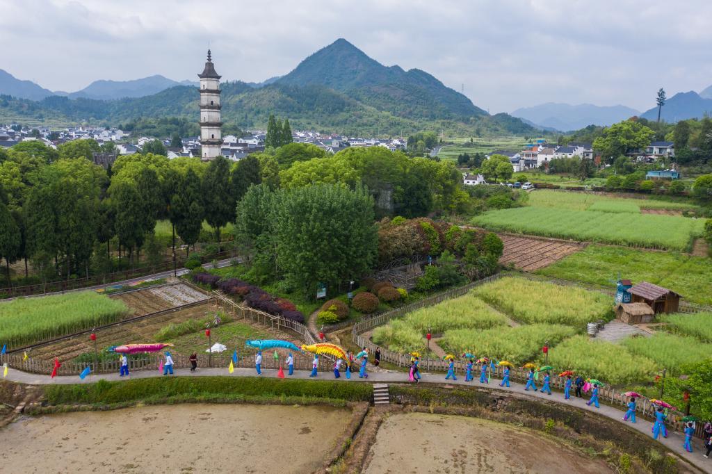4月21日,“严州虾灯”展演队伍行走在建德市大慈岩镇新叶古村的田野中(无人机照片)。新华社记者 徐昱 摄
