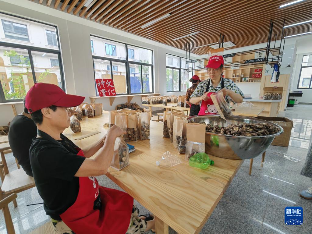6月14日,仙居县白塔镇上叶村“共富工坊”内,几位老年人在包装土特产。新华社记者 王俊禄 摄