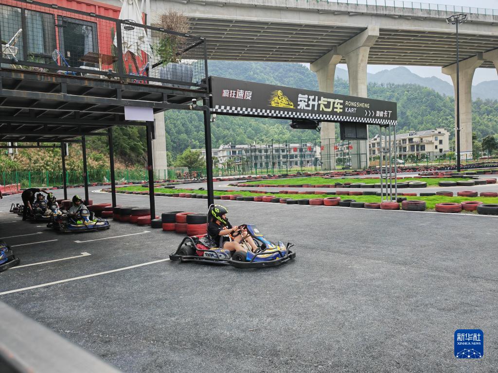 6月13日,几位游客在天台县平桥镇峇溪村的乡村游乐园驾驶卡丁车。新华社记者 王俊禄 摄