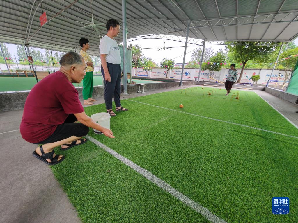 6月13日,天台县平桥镇山庵村几位老人在练习地击球。新华社记者 王俊禄 摄