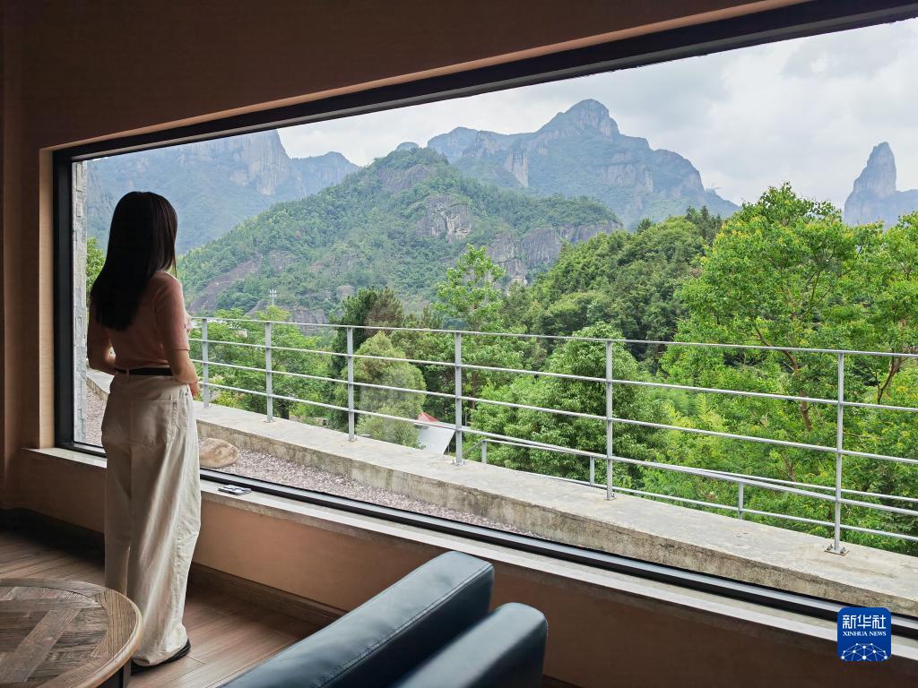 6月14日,游客在台州市仙居县一处民宿内欣赏窗外风景。新华社记者 王俊禄 摄