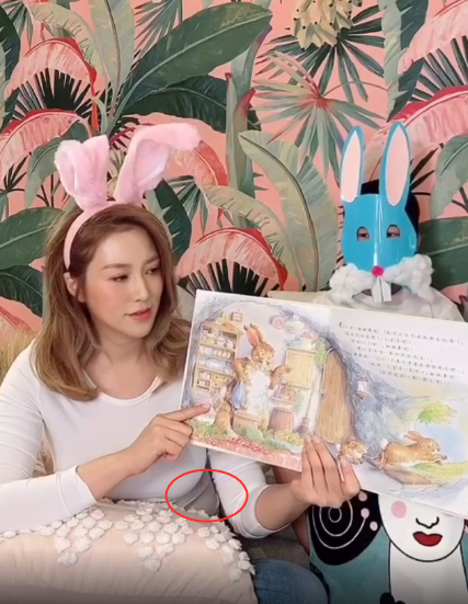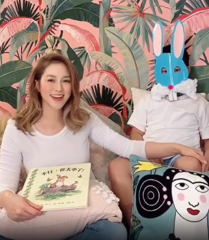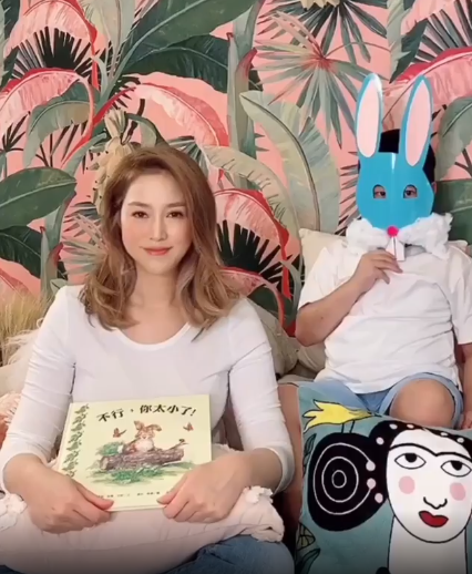 可能是为了保护孩子隐私,徐子淇的大儿子李俊熹戴着蓝色兔子面具出现在镜头下,母子俩坐在一起为屏幕前的小朋友讲故事,整个过程配合默契,互动画面温馨有爱。