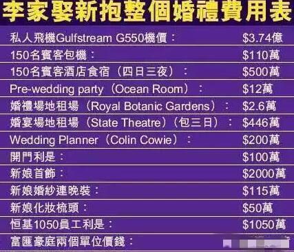 2006年,24岁的徐子淇成功嫁入豪门,媒体报道称整个婚礼十分奢华,总共花费7亿港币(约人民币6.39亿元),光是承包私人飞机就花了3.74亿港币(约人民币3.41亿元),更别提为新娘买首饰花的2000万港币(约人民币1826万元)了,出手十分阔绰。