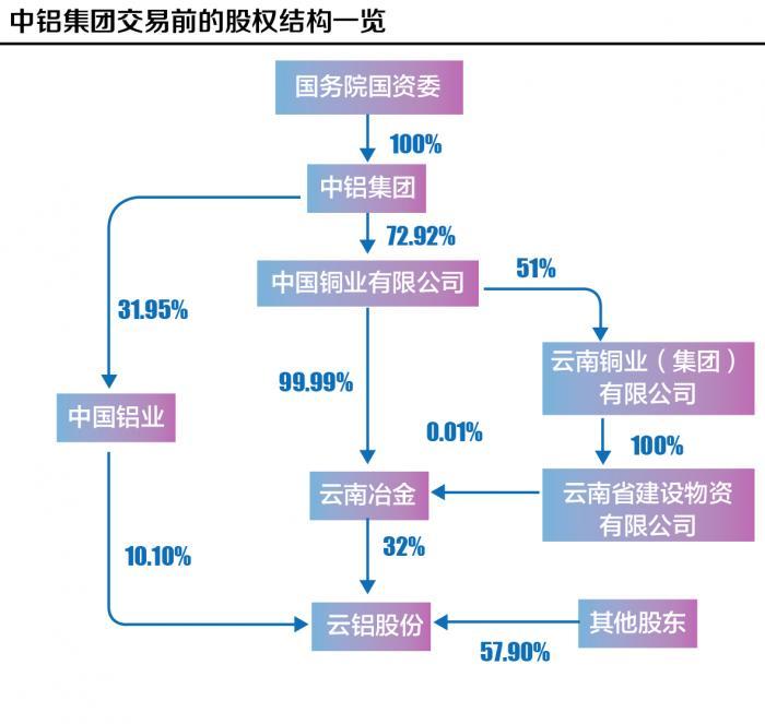 从股权架构上来看,本次交易前,中铝集团通过中国铝业控制云铝股份10.1%的股权,通过控股子公司中国铜业旗下的云南冶金控制了云铝股份32%的股权,合计间接控制云铝股份42.1%的股份。