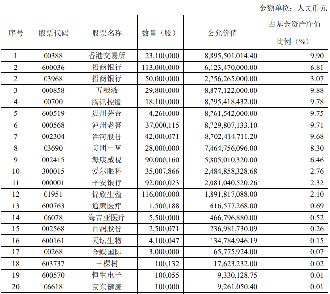 此外,通策医疗(600763.SH)、海吉亚医疗、百润股份(002568.SZ)、天坛生物(600161.SH)、金蝶国际(00268.HK)、三棵树(603737.SH)、恒生电子(600570.SH)、京东健康(06618.HK)分列第13位至第20位重仓股。
