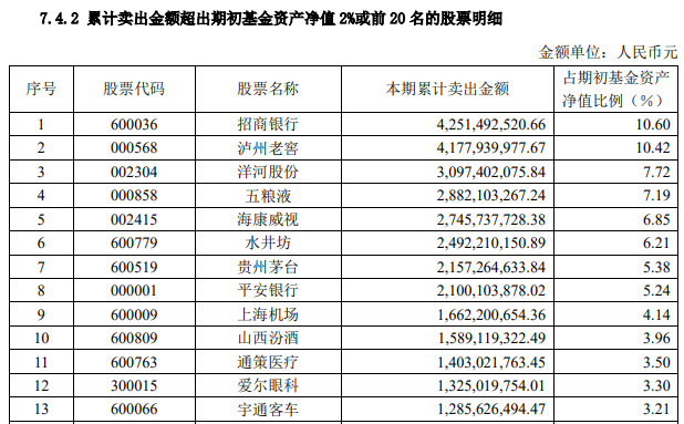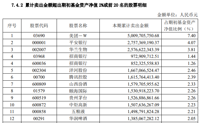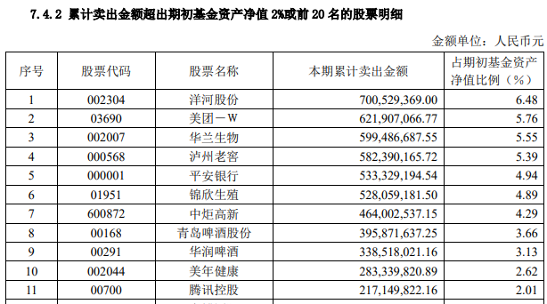 从中报披露的全部持股明细中不难发现,部分高端白酒、银行、医药股已在上半年陆续被张坤卖出,包括美团(03690.HK)、平安银行、华兰生物(002007.SZ)、招商银行A股和H股(03968.HK、600036.SH)、洋河股份(02304.SZ)、腾讯控股(00700.HK)、山西汾酒(600809.SH)、颐海国际(01579.HK)、贵州茅台(600519.SH)、中炬高新(600872.SH)、五粮液(000858.SZ)、华润啤酒(00291.HK)的累计卖出金额都超出期初基金资产净值2%。