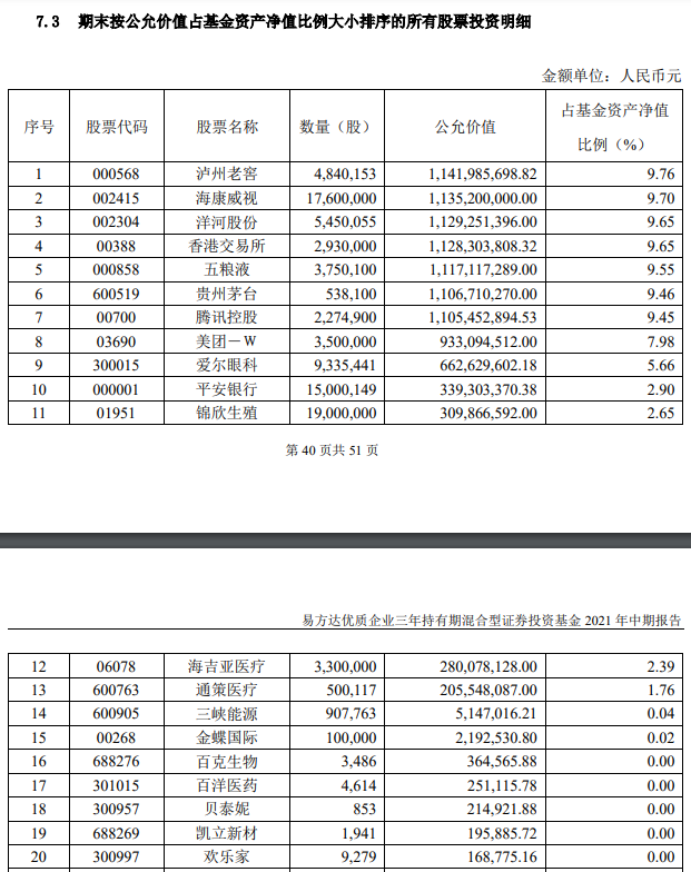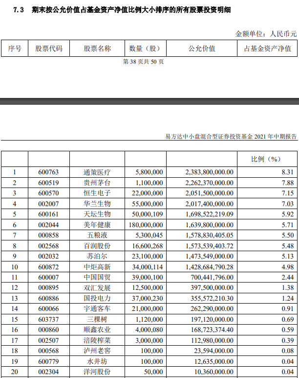 此外,双汇发展(000895.SZ)、国投电力(600886.SH)、宇通客车(600066.SH)、三棵树(603737.SH)、顺鑫农业(000860.SZ)、涪陵榨菜(002507.SZ)、泸州老窖(000568.SZ)、水井坊(600779.SH)、洋河股份分列易方达中小盘第12位至第20位重仓股。