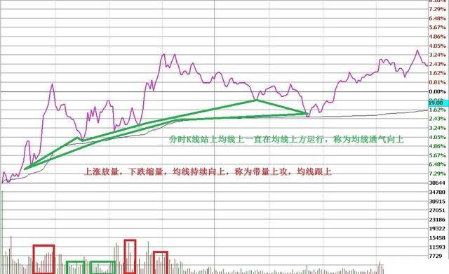 高开后高走,均线向上通气,后浪底高于前浪顶,均线跟上(带量上攻)
