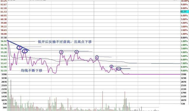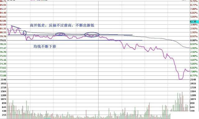 低开后反抽不过前高且高点下移,均线跟下