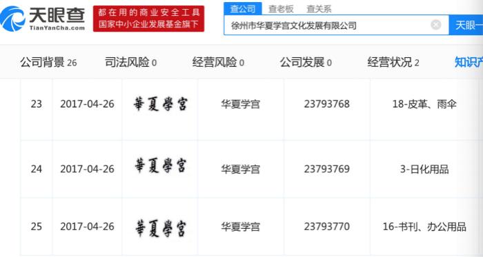 据天眼查信息显示,华夏学宫所属的徐州市华夏传统文化专修学校是一家民办非企业单位,拥有非学历培训机构资质,由徐州市教育局主管。而华夏学宫文化发展有限公司则是一家有限责任公司,占股40%的易菁是公司大股东。2017年,华夏学宫文化发展有限公司在经营范围中加入了非学历职业技能培训,还拥有多个与华夏学宫相关的商标。