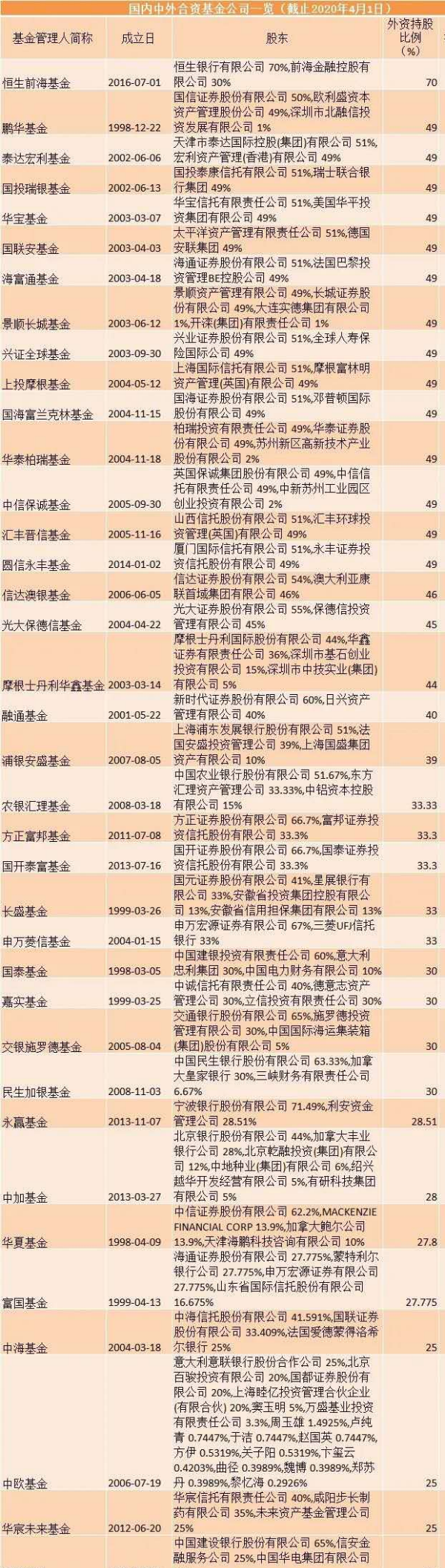 wind数据显示,目前国内128家基金公司中,合资基金公司共有44家,除了恒生前海基金通过CEPA新政框架实现外资控股之外,还有包括鹏华、景顺长城、泰达宏利等14家基金公司外资持股比重达到49%,距离绝对控股仅1步之遥,未来这些基金公司中,也有可能诞生外资控股基金公司。