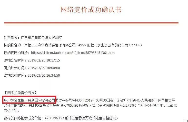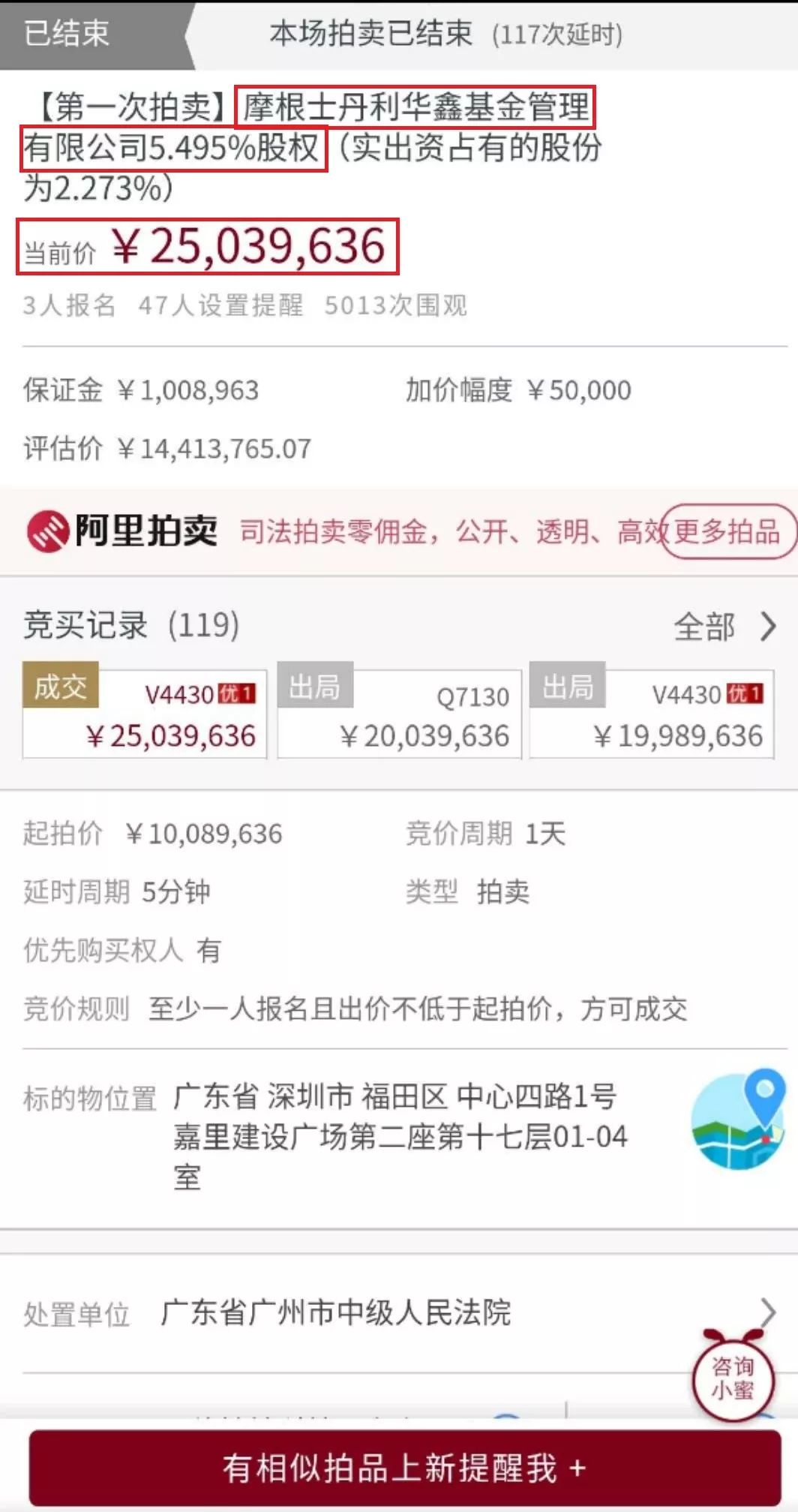 此次拍卖于今年3月29日开始,至3月30日结束,5.495%股权评估价格1441.37万元,起拍价格1008.96万元,竞拍公告同时显示,本次拍卖之中,大摩华鑫基金公司现有股东方——华鑫证券、摩根士丹利国际控股公司、深圳市招融投资控股公司、深圳市基石创业投资有限公司均享有优先购买权,深圳市基石创业投资有限公司要求行使优先购买权。