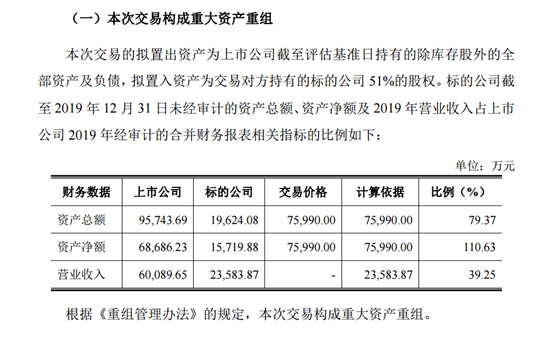 交易预案显示,本次交易中,标的公司100%股权预估值为14.9亿元,对应置入资产的预估值为7.60亿元。截至2019年年末,华付信息资产总额1.96元,资产净额1.57亿元,2019年营业收入2.36亿元。同期,上市公司资产总额9.57亿元,资产净额6.87亿元,营业收入6.01亿元。