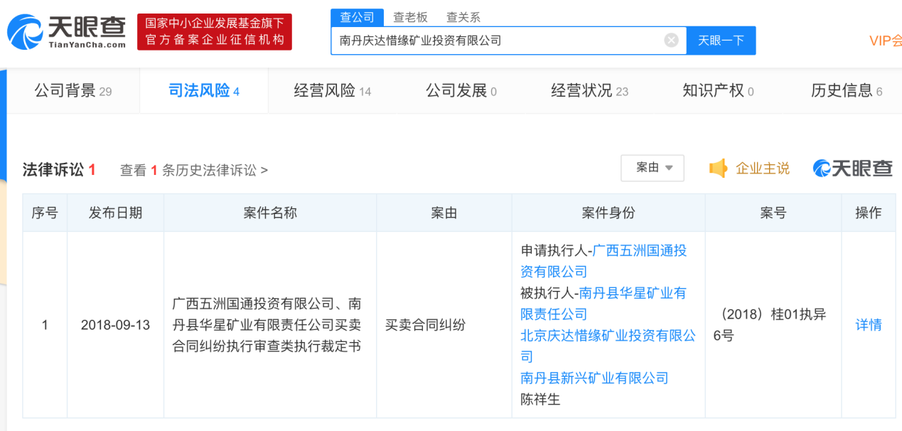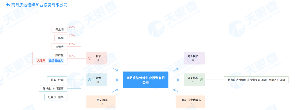 天眼查显示,南丹庆达惜缘注册资本为3000万元,法人代表陈祥生,成立时间为2004年10月,曾用名“北京庆达惜缘矿业投资有限公司”。该公司的经营范围为:锌矿、银、铅、锡、锑、铜开采(凭许可证有限期限经营);矿业投资、矿产地产勘查;销售金属矿产品、建材、化工产品(不含化学危险品)、机械设备、五金交电、电子产品。公司分支机构为北京庆达惜缘矿业投资有限公司广西南丹分公司。