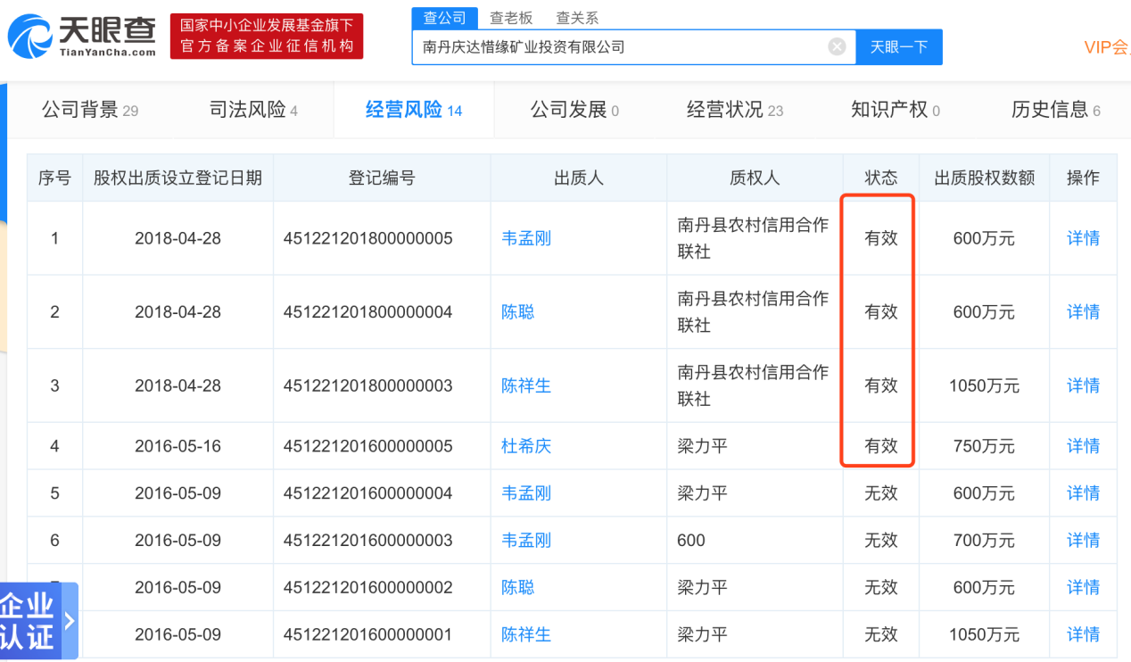 天眼查显示,该公司所有股东的股权均已部分或全部质押。2016年5月16日,股东杜希庆将750万元的股权质押给自然人梁力平;2018年4月28日,法人代表陈祥生将1050万元的股权质押给南丹县农村信用合作联社;同日,陈聪和韦孟刚也将600万元的股权质押给南丹县农村信用合作联社。