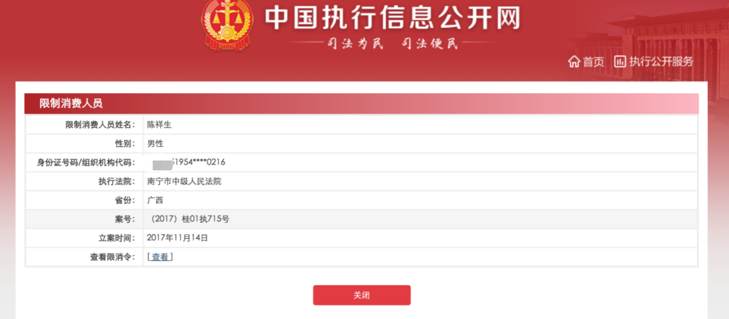 2018年9月13日,中国裁判文书网发布《广西五洲国通投资有限公司、南丹县华星矿业有限责任公司买卖合同纠纷执行审查类执行裁定书》显示,被执行人为1954年7月15日出生的陈祥生,且其住所地在广西壮族自治区南丹县。