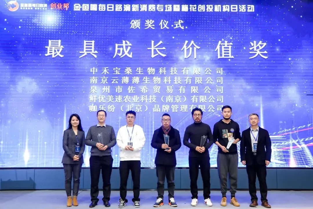 中禾宝桑生物科技有限公司、南京云薄薄生物科技有限公司、泉州市佐希贸易有限公司、鲜优美速农业科技(南京)有限公司、咖乐纷(北京)品牌管理有限公司等5家企业获得了由同创伟业合伙人段瑶、青松基金创始合伙人董占斌颁发的最具成长价值奖。