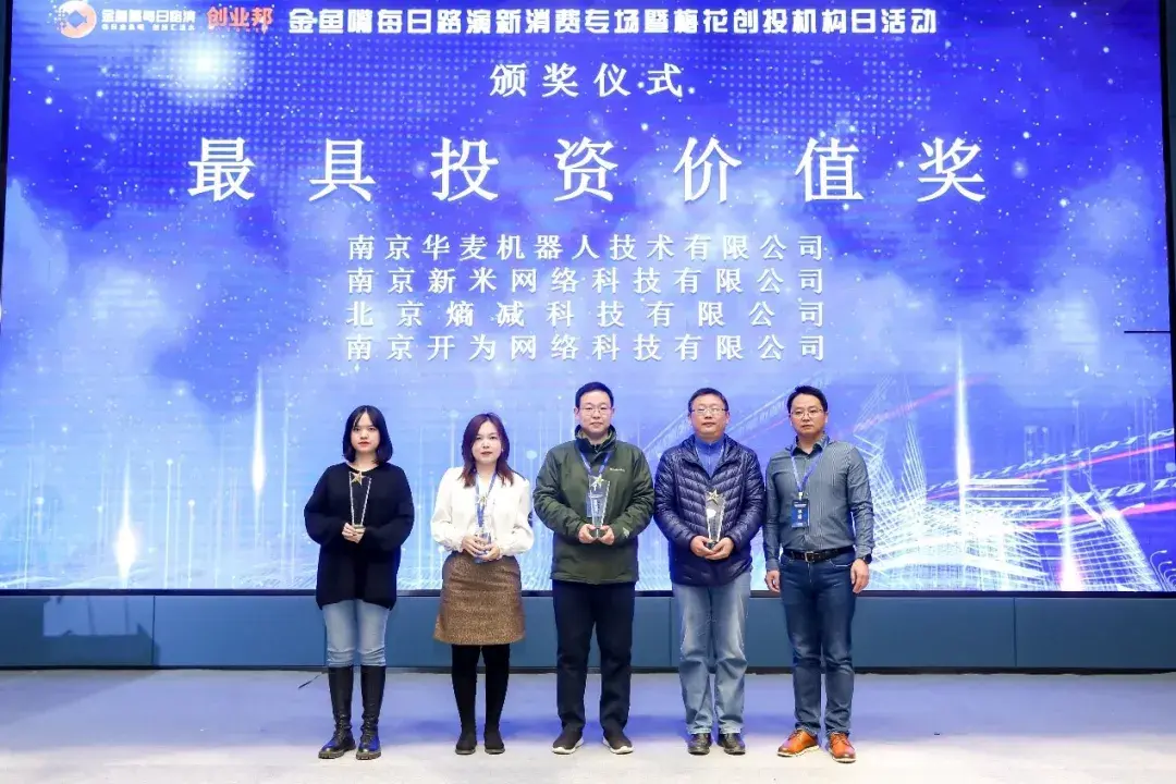 最终,南京华麦机器人技术有限公司、南京新米网络科技有限公司、北京熵减科技有限公司、南京开为网络科技有限公司获得了金鱼嘴每日路演最具投资价值奖,由梅花创投合伙人吴世鸿为他们颁奖。